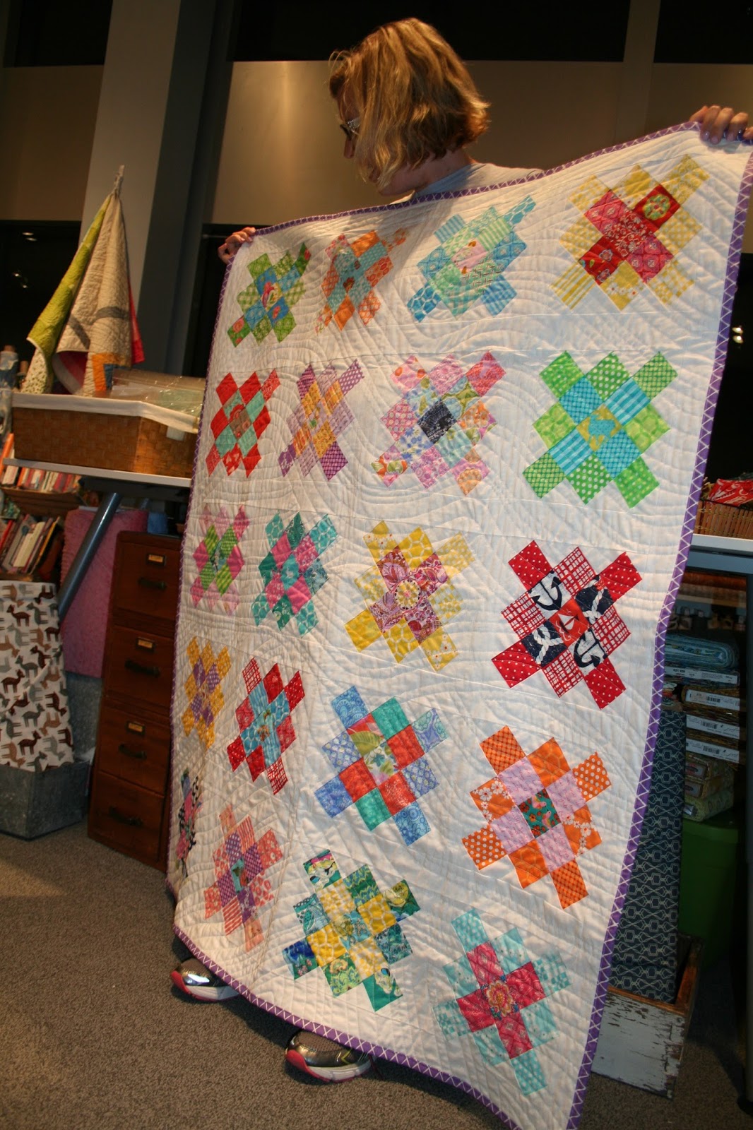 Then, in a moment we all love to see, she shared her first finished quilt! She recently finished Melanie’s Quilting 101 class to “put all the pieces together” and even though her kids love to roll on it, she stated definitively that it’s hers!