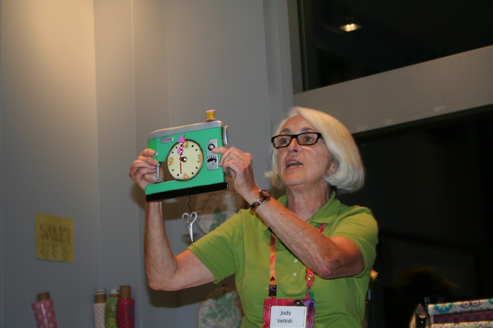 Judy shared a wonderful project she made as a “quick project” with another guild and then peaked all of our interest with a box. She promised that we would all want to take it home, and she was right! Of course we all need a vintage sewing machine clock!