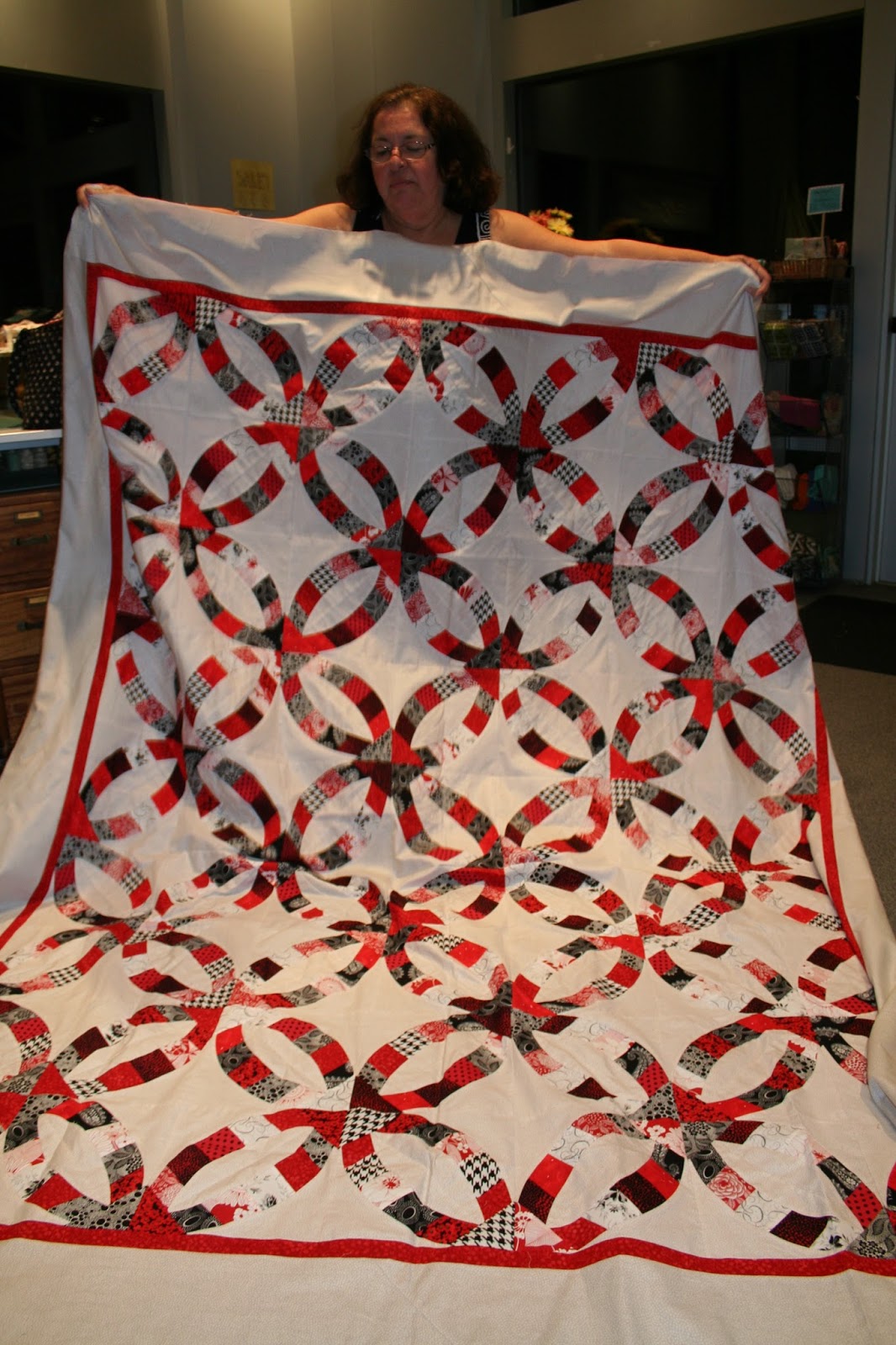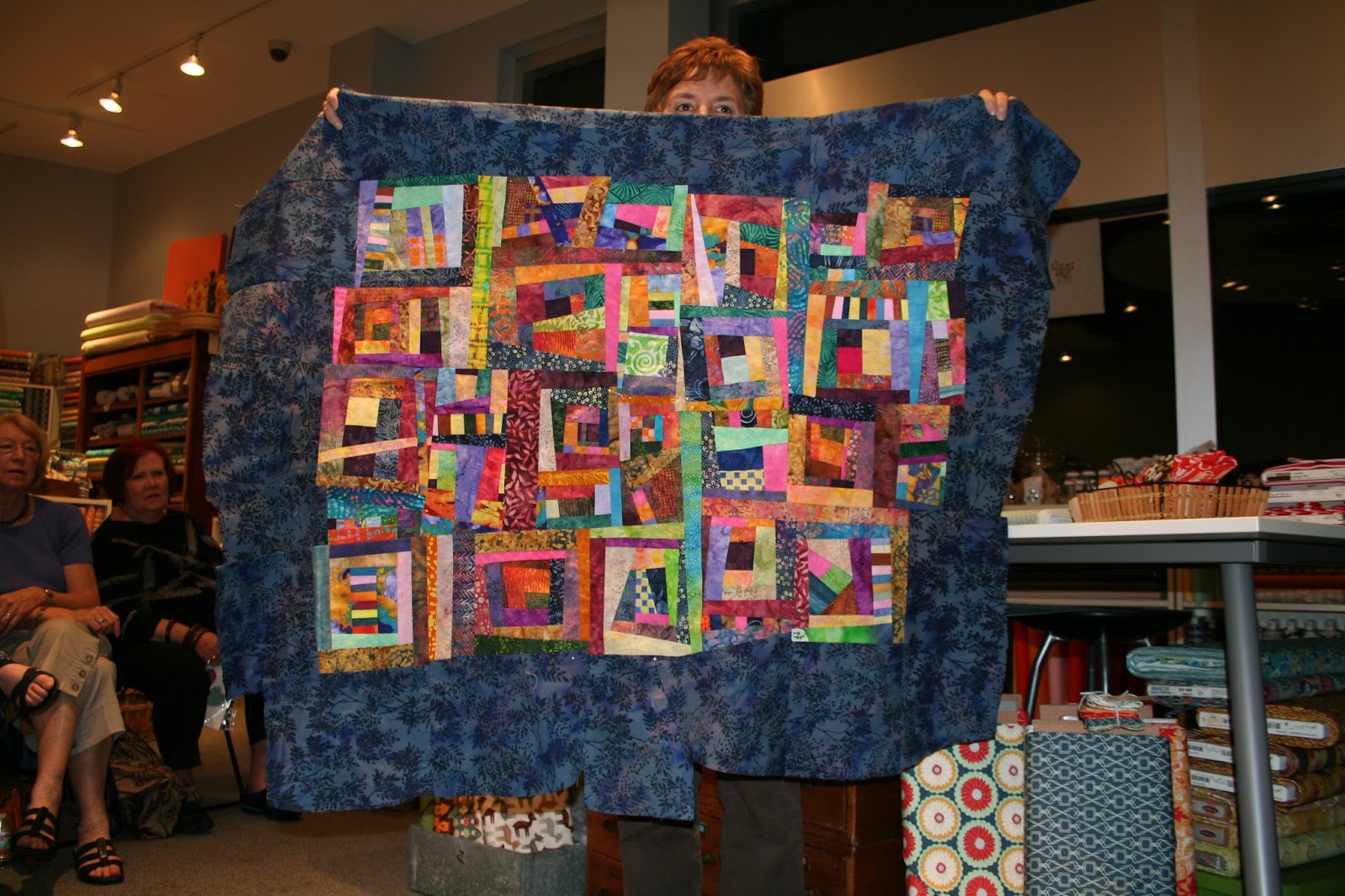 Carol came for the first time and braved the crowd to share her stunning Twisted Sister quilt. Much to our disappointment, the fabrics were all 10 – 15 years old. She also shared a beautiful self-portrait quilt that left us all in awe! Of course, we couldn’t help but notice that she sat through the meeting making gorgeous jewelry which means she’s right at home in Rock, Paper, Scissors!