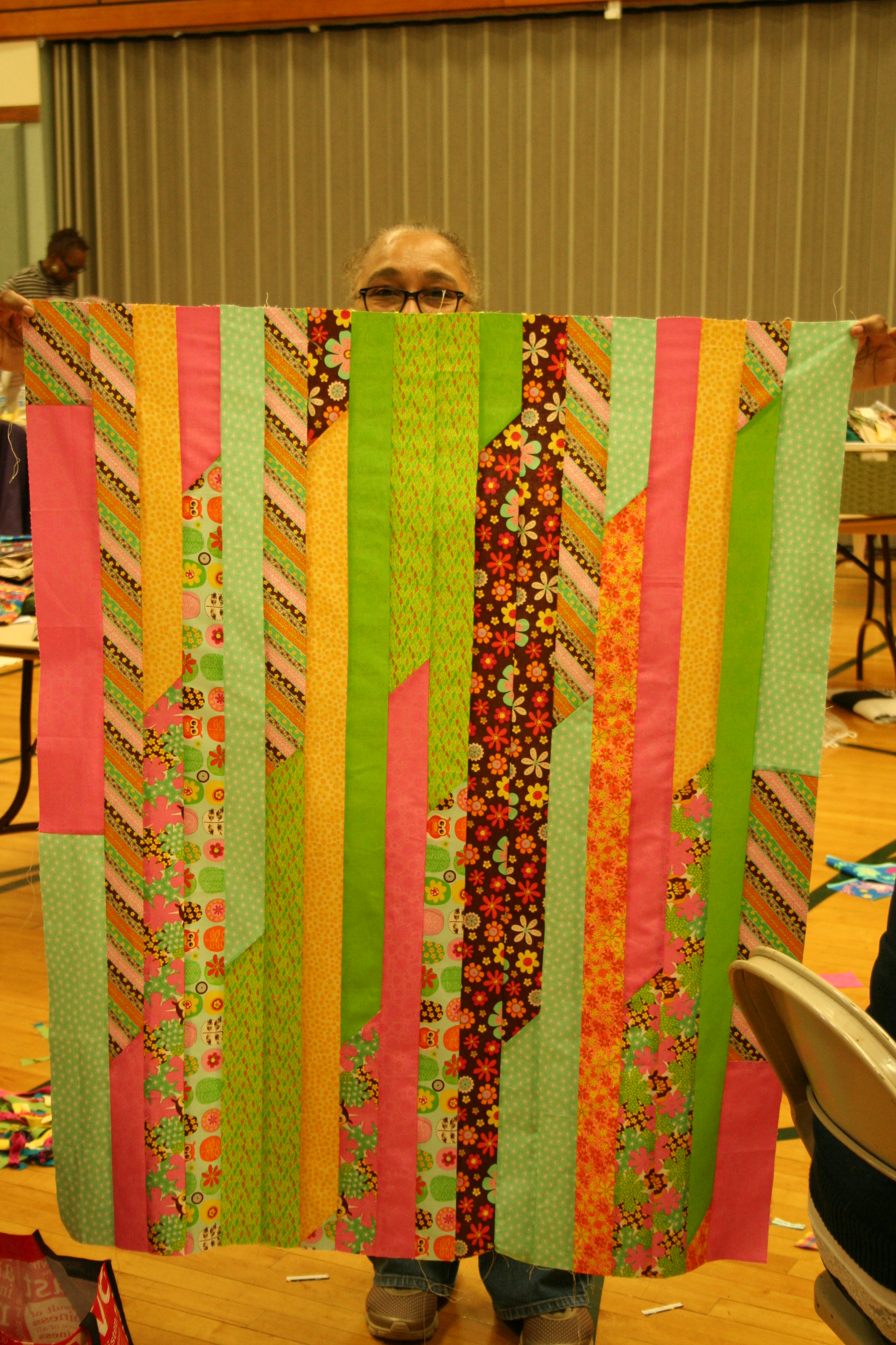 Our magnificent hostess Stephanie not only set up the gym with quilts and flowers and extension cords, but she also put together our Cloud 9 challenge blocks into a stunning quilt: