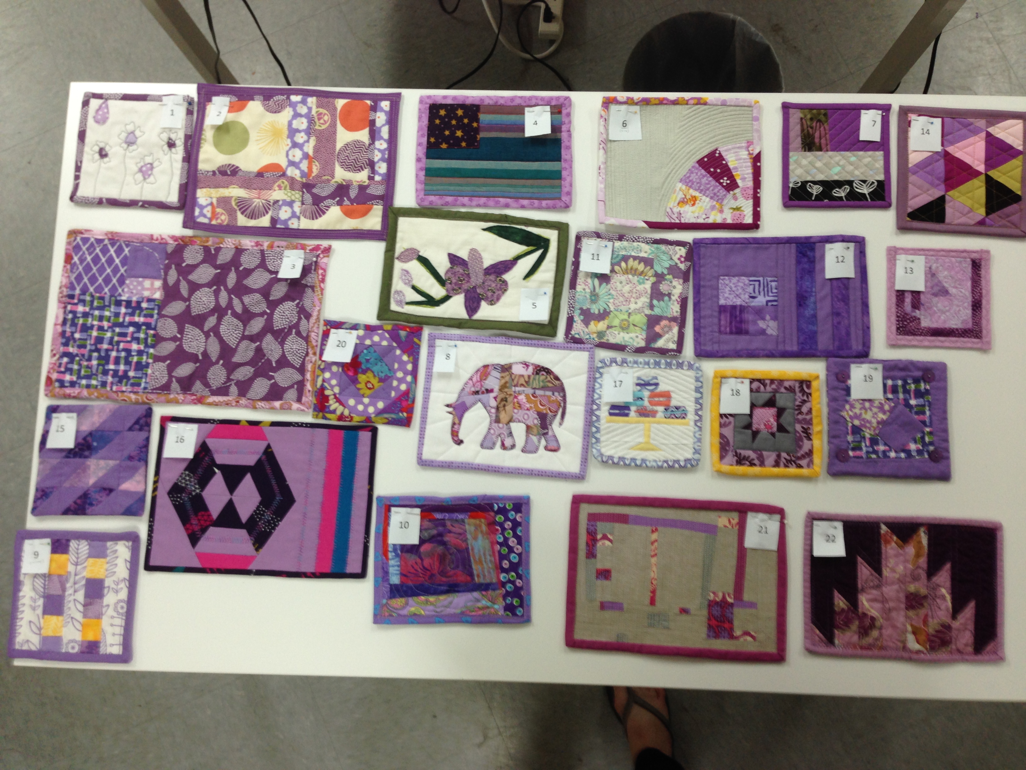 We had our first ever swap at the June meeting– rug mugs inspired by Radiant Orchid, Pantone’s color of the year. Everyone who made one got to take a different one home. Check out the gorgeousness that our guild produced!