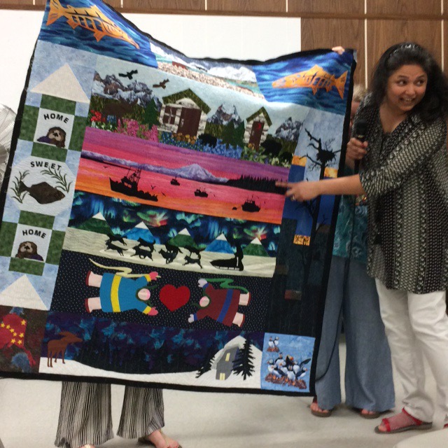 The “one hour baskets” received from CJMQG for our members who participated in the swap were handed out. The baskets were quite nice, and lavishly filled with goodies. Lots of happy faces!
