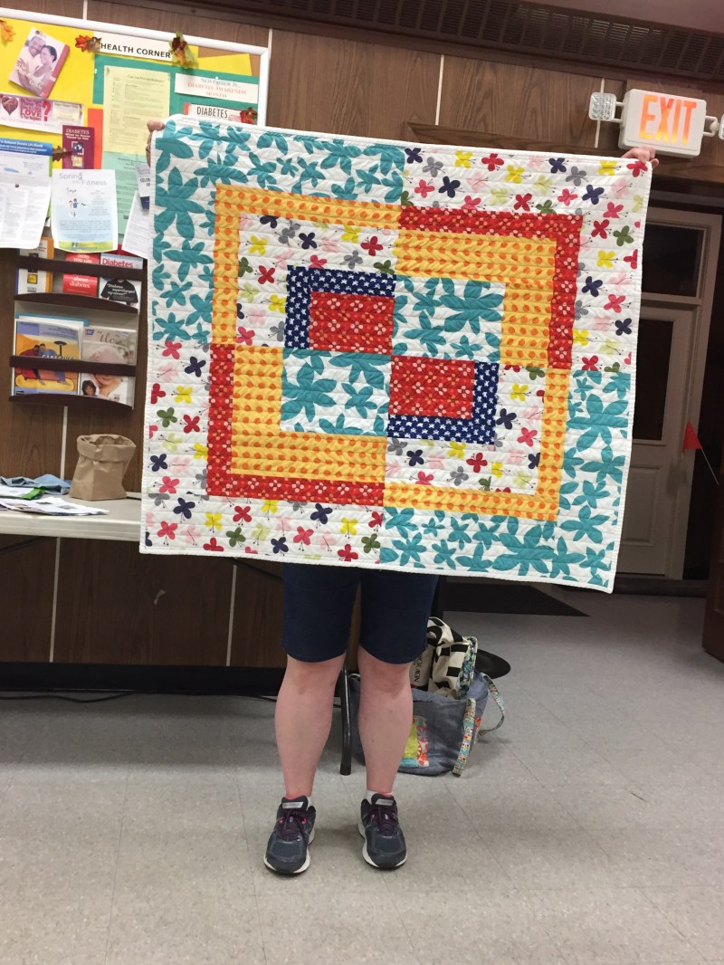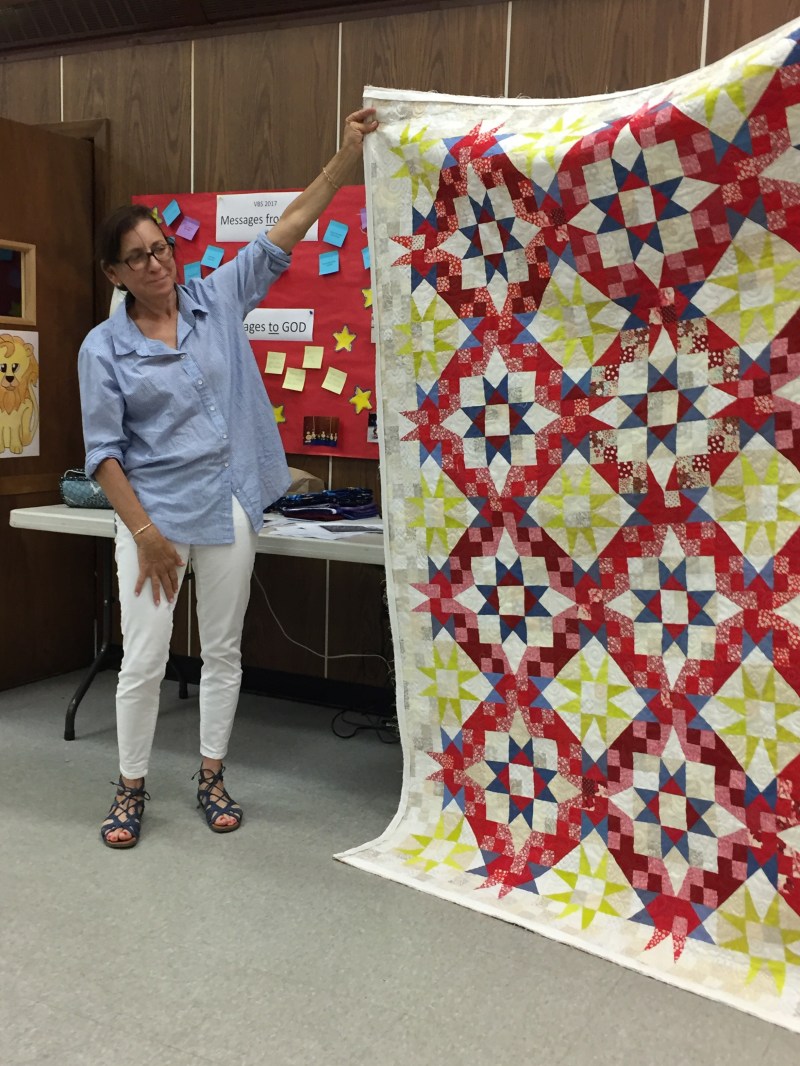 • Betsy and Melanie- The charity quilt for Quiltcon 2018 theme is Modern Traditional. The colors are white, ivory, yellow, orange, cerise, purple, and red. Betsy and Melanie have come up with two ideas. Stripes and Flecks and Stars and Stars. (A surevey went out and Stars and Stars was chosen by the members). September fabric will be handed out. October blocks will be collected. November blocks will be assembled. January 14 is the due date.