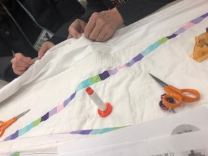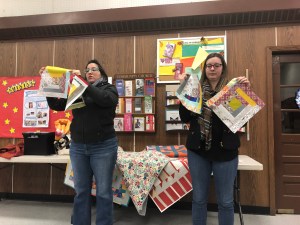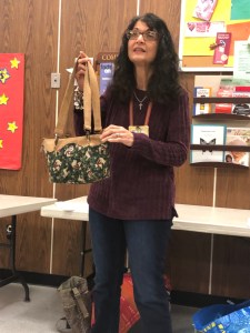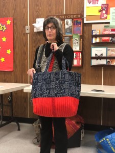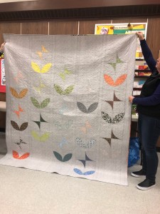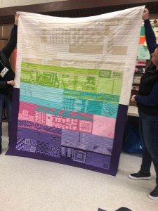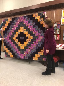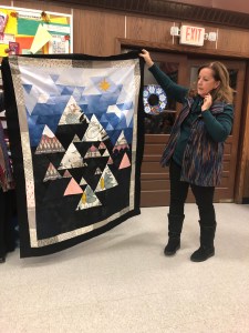 Rachel talked to us about charity. We sent 16 quilts to the Robert Kaufman to be donated the victims of the CA fires. We sent 25 lbs of scraps to The Social Justice Sewing Academy. We had a suggestion of buying white to have in charity bin. Terri talked to us about Quilts of Valor, and we will be collecting 12 1/2″ blocks. We are also going to have a new kit to replace the New wave pattern we were using for charity Quilts. We are also having a block drive, due in March, we are asking for as many scrappy log cabin blocks you can make. As always, we have bundles made up, sandwiches ready to be quilted, tops that need backs, all sorts of things waiting to be given a little love and attention for charity donations.