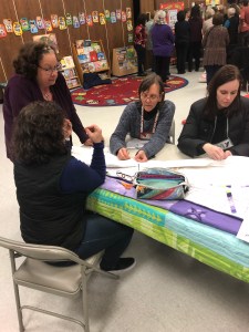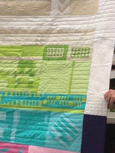 While the meeting was going on, we had some fabulous ladies, putting a sleeve on our Quiltcon charity quilt, Pieceful Integration. Thanks to Ameri and Amy for your beautiful design and all the hard work you put into it. Thanks to Diane for the wonderful quilting. Thanks to Lori for the label and to everyone who made a block and helped in any way.