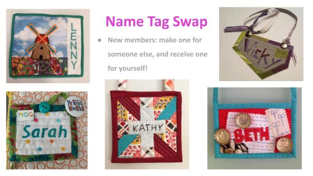 If you are new and don’t have one, or if you are returning and can’t find yours, this opportunity is for you. Rachel will be sending out an email on how to sign up and participate. The photos above are some of the previous swap name tags for inspiration.