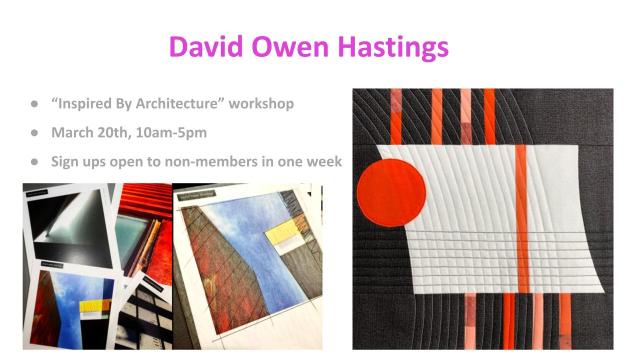 Our March guest speaker will be David Owen Hastings davidowenhastings.com. There is still space available in his Saturday workshop.