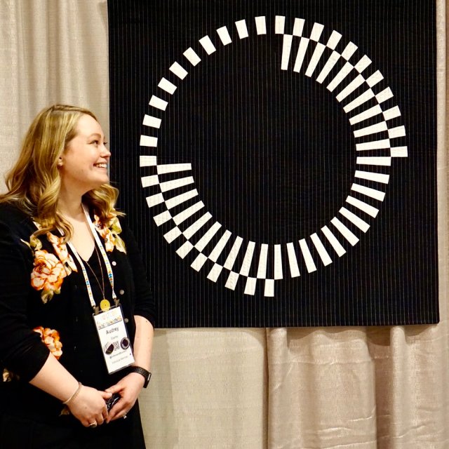 We moved right into our guest speaker, Audrey Esarey of Cotton & Bourbon. “Finding my voice in quilting” was the theme of her lecture and it was fascinating to see the evolution and trajectory of her work over time. She got started quilting after being invited to a class by her, then, future mother-in-law. Inspired by Caryl Bryer Fallert Gentry, Jonathan Lawes, and Nancy Crow, Audrey works with a lot of hand died fabric and curves, but is always interested in challenging herself (and the limits of EQ8). It was lovely having Audrey share with us. We are hosting a workshop with Audrey on April, there are still some spots open. You can sign up here. Come play with foundation and curved paper piecing in the Ultraviolet Radial workshop.