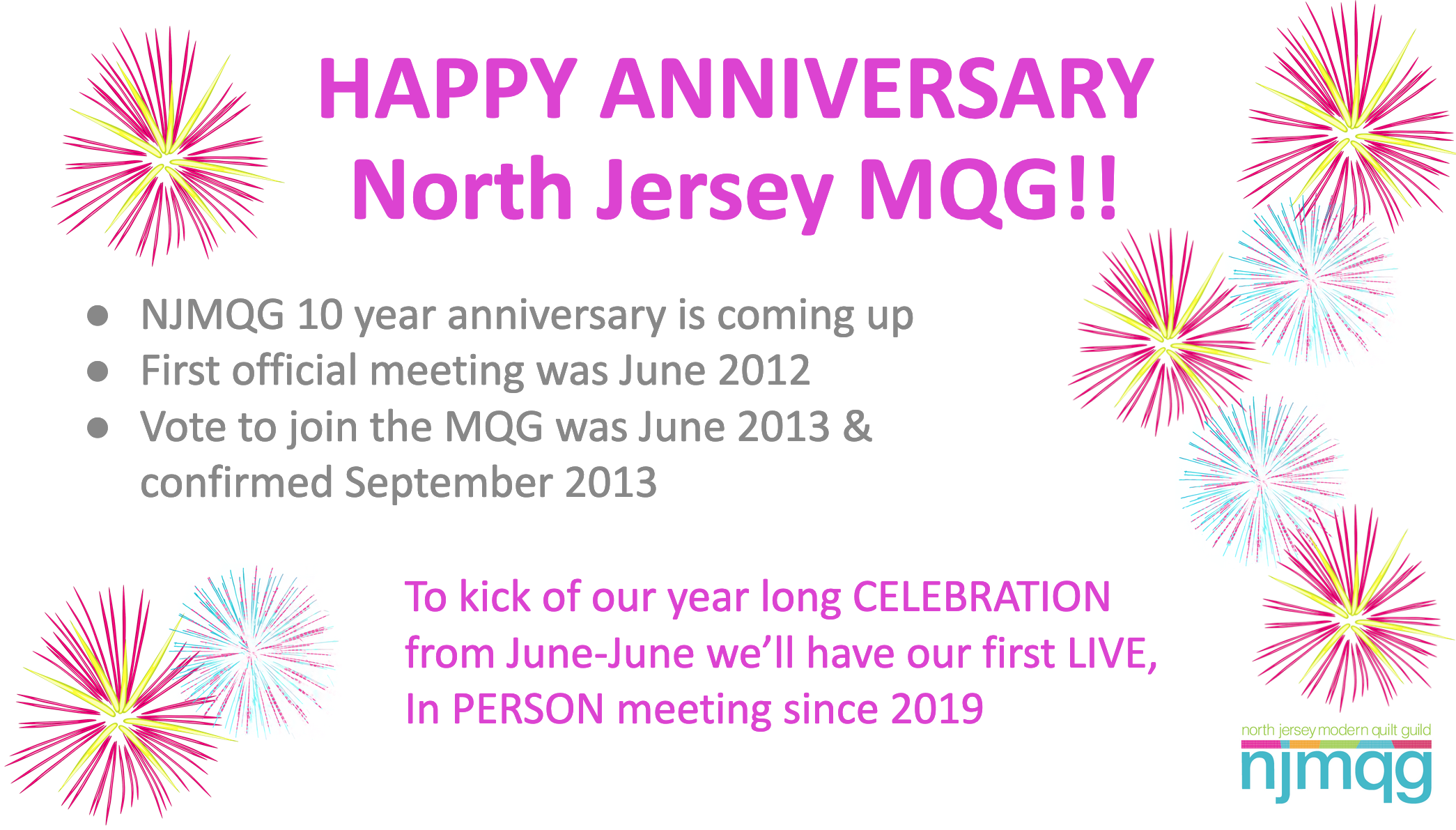Hope to see you at our IN PERSON anniversary meeting on June 25 at the Community Church of Cedar Grove, starting at noon. More details to come soon, but be prepared to come with a cup/mug, a fat quarter to play a game with, your pouch swap (if you signed up), and any show and tell you’d like to share with us! As always we hope you are getting your craft on and staying well!