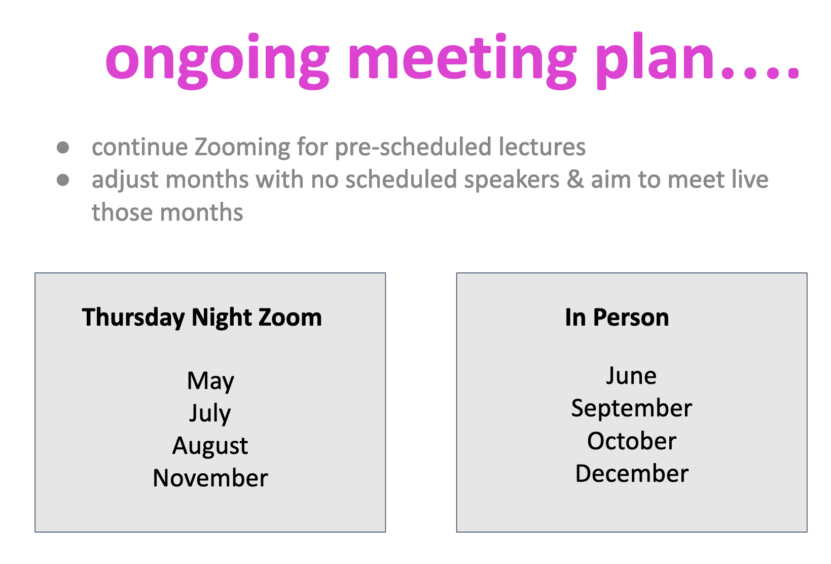 In an effort to be have a little face to face, we have picked some dates that we would like to meet in person. We are mixing it up in hopes to have as many people join us, so we are sticking with our zoom meeting for the third Thursday of the month and in person on Saturdays. Of course we will keep in mind the recommendations of what is going on at the time and realize everyone has a different comfort level, but we are hoping to continue to be able to see each other more in the “real” world. We have some more great lectures planned for some of the zoom meetings.
