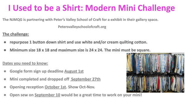 We are very happy to announce our newest challenge. This one will be fun, and it is going to culminate in a show at Peter’s Valley! Get your ideas in motion…but wait, there are some rules… We are asking members to make a square mini quilt (18-24″ SQUARE). To keep it somewhat “cohesive”, we want a palette of WHITE/CREAM and incorporating 1 button down shirt. And that’s it! Whatever a button down shirt translates to you with white or cream and a square. The google form to sign up was emailed, but if you need it sent again, reach out to a board member. Sign up deadline is August 1. The mini’s need to be handed over by September 27, so they can be hung in time for the opening reception. The show will run for October and November. You are welcome to make more than one AND you have the option to put the quilt up for sale (the gallery is able to help with pricing, too!) If you have any questions, reach out to any board member or Christa. OH! Keep the scraps from your shirt, too. We’ve got another thing up our sleeves (come on, I had to) for those. Stay tuned!