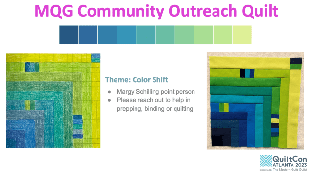 The guild’s MQG Community Outreach Quilt is in progress. Block kits have been distributed and are due back by the October 29 open sew. We are piecing it on that day. If there is any interest in helping with backing, quilting, binding, labeling, or any step of the way, please reach out to the board or Margy, who is our point person for this. As a reminder, this is what we are working on.