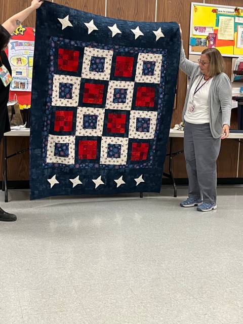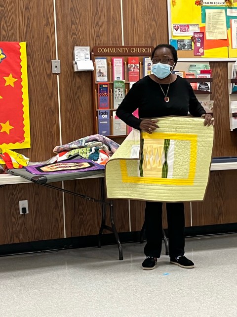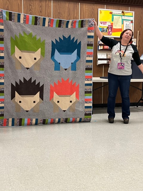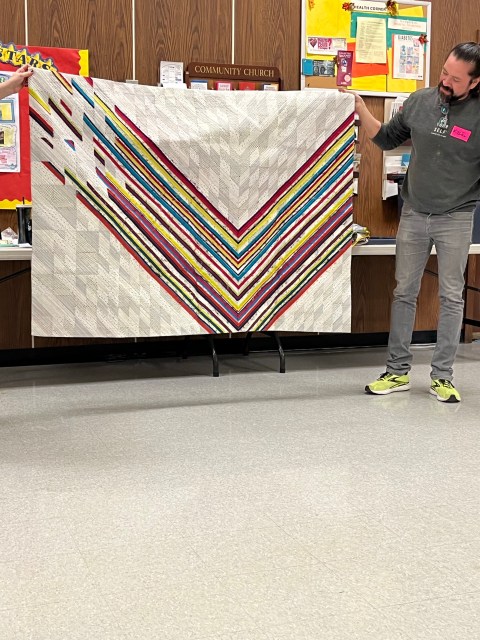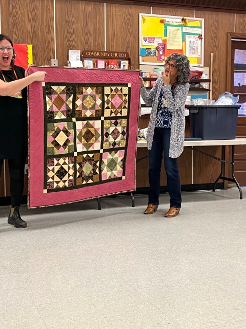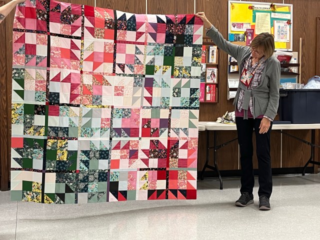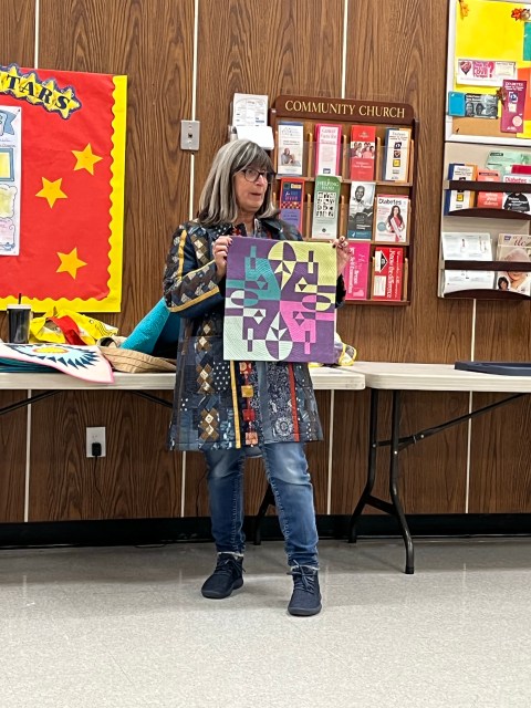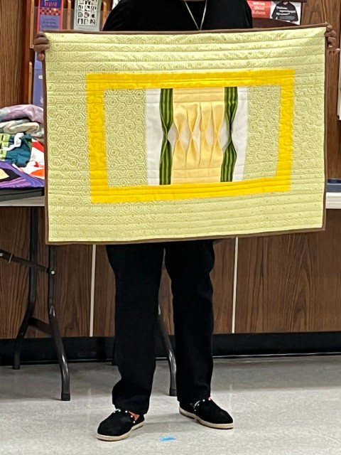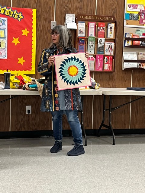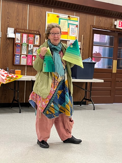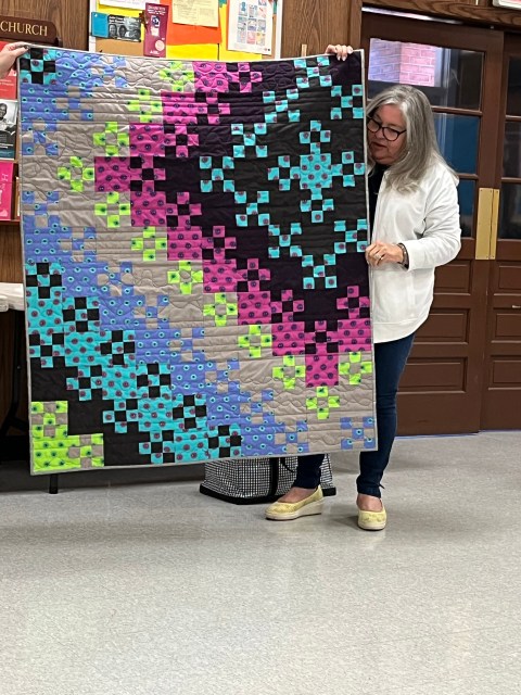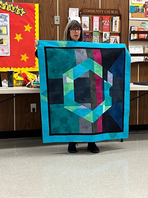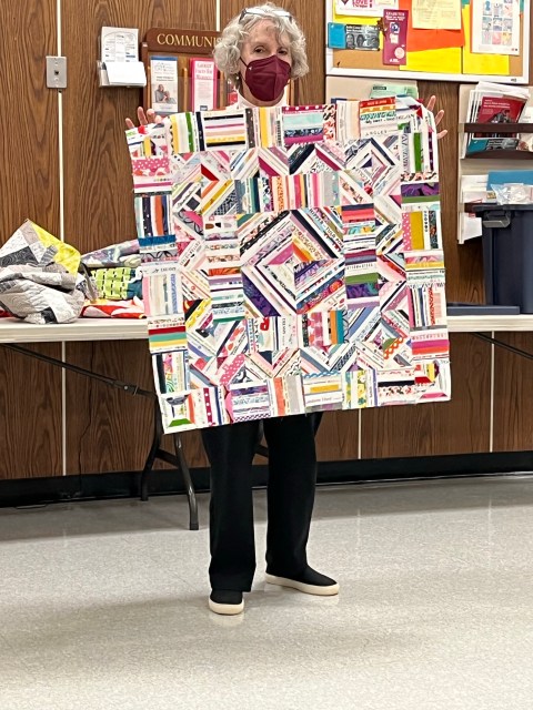 Margy was on hand collecting the MQG Color Shift quilt blocks. They’ll be trimmed and ready to piece together at our open sew on Saturday October 29. Thanks to Carolyn who offered to quilt it for us!