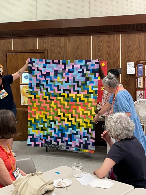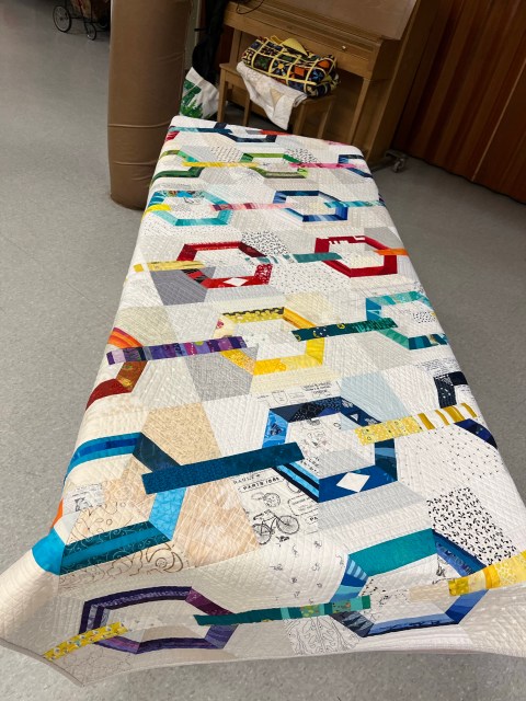 There were a few quilts out for display. First we had last years Quiltcon community outreach quilt. Since it didn’t sell at Quiltcon we were going to add it to the donation pile, but it was decided to gift it to a member who needed some extra love and comfort. What better way than a quilt made with love by the guild?
