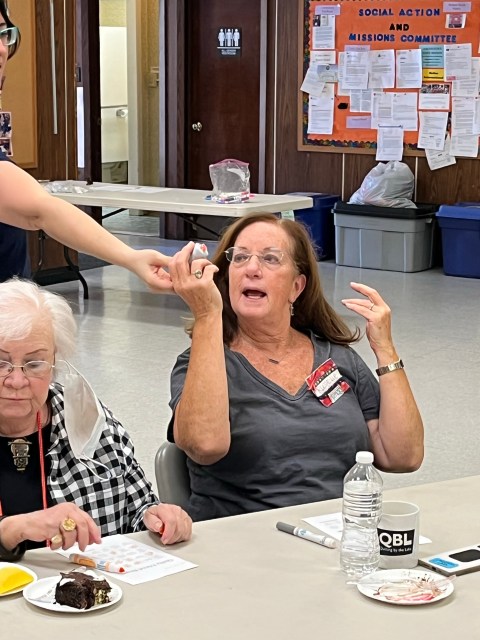 Since it was a party we had some games to play! There were three simultaneous rousing games of ‘Left, Right, Center’ where, Sarah, Claire, and Tari went home with some nice stacks of fat quarters!! Some more lucky ticket holders got some prizes (congrats Pam and Julia) and a we played a Quilty Friend edition of Bingo (congrats to Rochelle) So much fun!!
