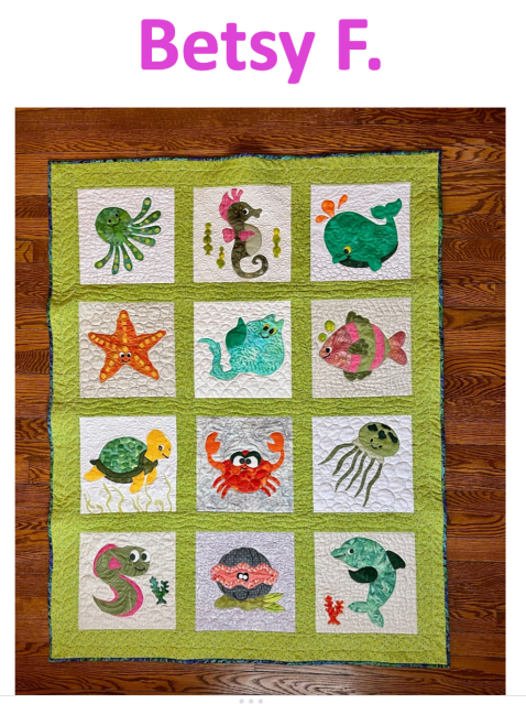 Penny let us know that the Warwick Valley Quilt Guild has gotten permission to go ahead with a quilt show this year! I’m sure we will be reminded, and encouraged to enter, but keep October 15 & 16 in your calendar to go visit. It is always a good show! Susan wanted to know the name of the pattern designer who does the animal quilts…Elizabeth Hartman for the win!